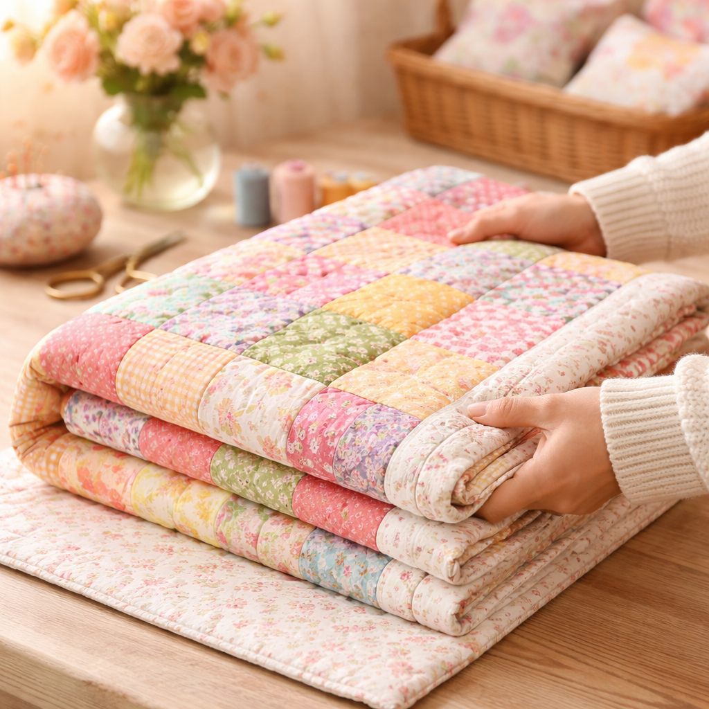 Fertige Patchworkdecke wird sorgfältig gefaltet und gepflegt